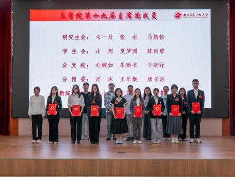 会议听取了南京信息工程大学文学院第二十次学生代表大会、第八次研究生代表大会的筹备工作与资格审查报告。报告系统梳理了过去一年学生会在组织建设、志愿服务等领域取得的进展,持续增强学生组织工作的针对性、实效性与服务覆盖面,并对下一阶段任务作出展望与部署。第八届研究生会主席团成员朱一丹与第十九届学生会主席团成员陈雨馨分别作年度工作报告。与会嘉宾为第十九届文学院团学组织主席团成员颁发聘书。