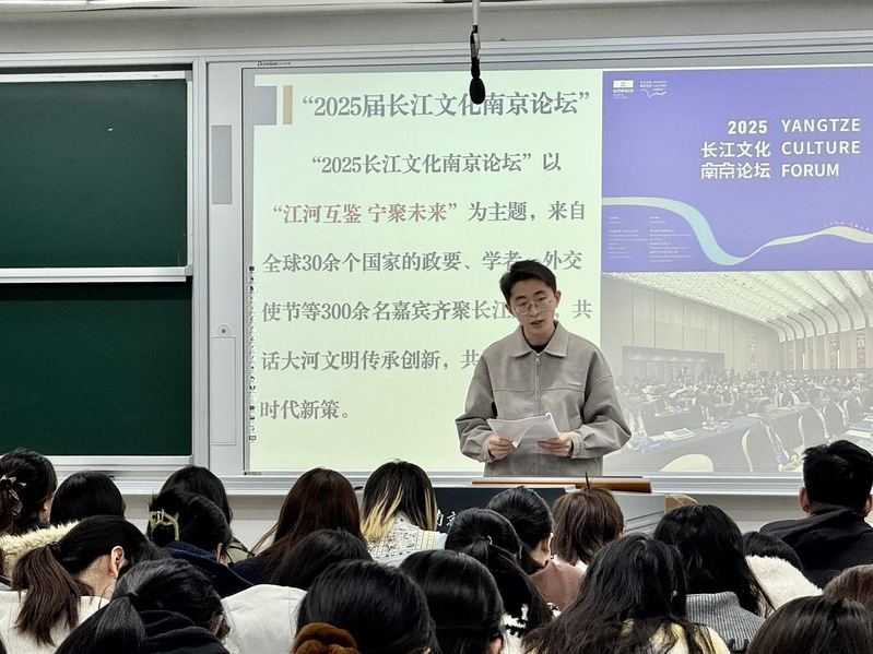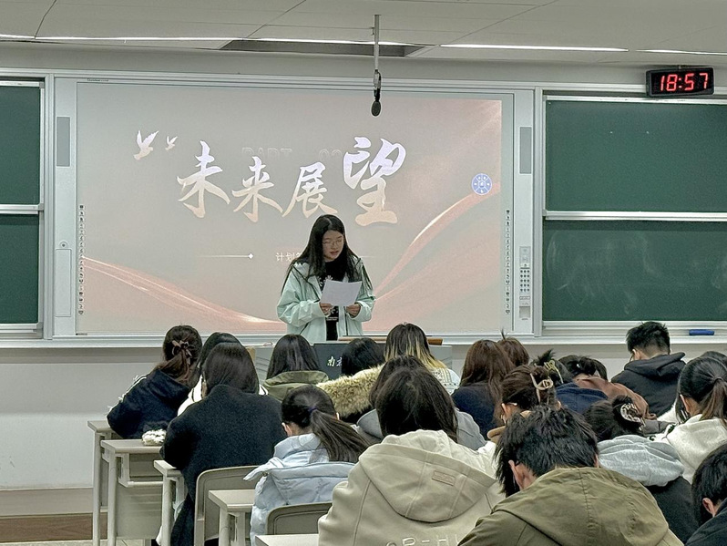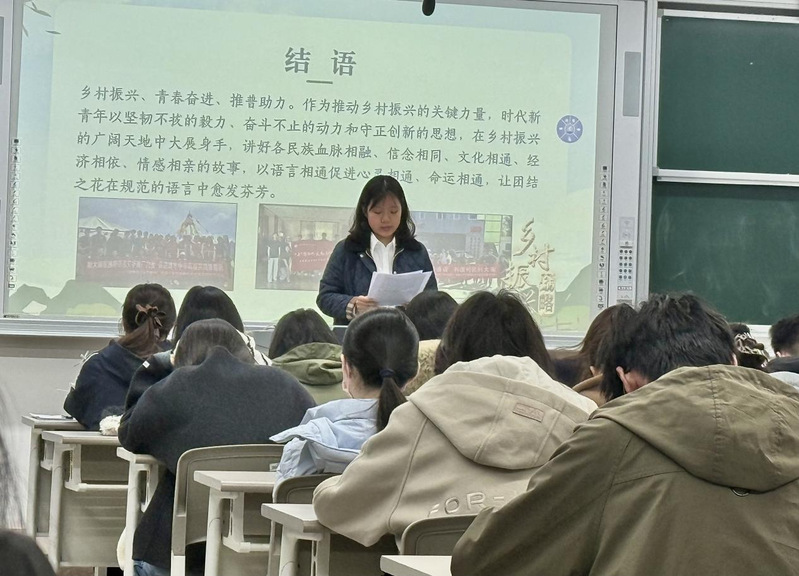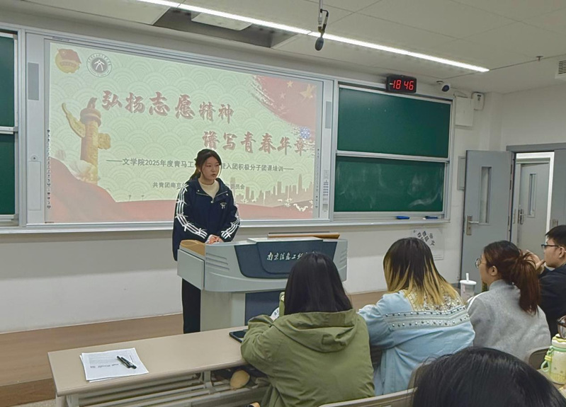 本次团课培训紧扣“文学赋能社会”主线,突出文学院学科优势与育人特色,展现青年学子将专业知识转化为社会服务的创新探索。学院青年志愿者协会部长廖李林以《以文学之舟筑乡野之梦》为题,系统阐述志愿精神的时代内涵,并重点介绍文学院社会实践团队深入乡村一线的成果。她指出:“文学从来不是象牙塔里的孤品,而是能扎根泥土、滋养人心的力量。”2024级本科团总支书记薛雯文带来《以推普为笔,绘就乡村振兴与民族团结新图景》主题宣讲,分享其带领“‘普’写振兴·文苑清风”推普志愿小分队赴青海省黄南藏族自治州尖扎县的实践经历。院研究生会主席团成员吴奇以《江畔志愿行,青春正当时》为题,讲述作为“2025长江文化南京论坛”优秀志愿者的服务经历。他总结“热情投入、科学分工、从容应变”三大服务心得,并强调:“每一次微笑、每一份坚守,都是对青年责任最生动的注解。”