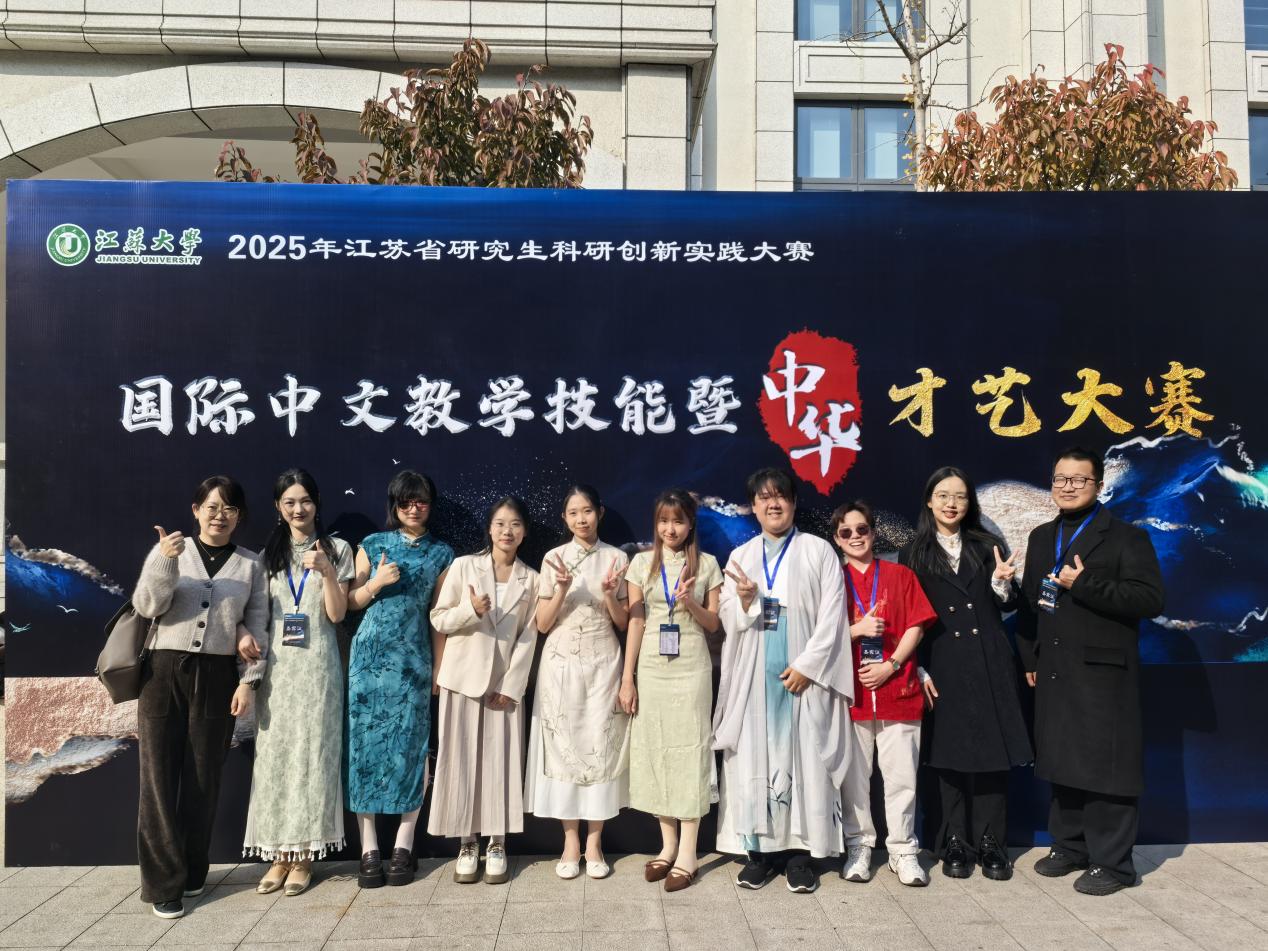 2025年11月22日至23日,由江苏省文学类研究生教育指导委员会主办、江苏大学承办的“2025年江苏省研究生科研创新实践大赛——国际中文教学技能暨中华才艺大赛”在镇江圆满落幕。由许晗、徐开妍老师带队,国际中文教育专业11名研究生参加了此次大赛。