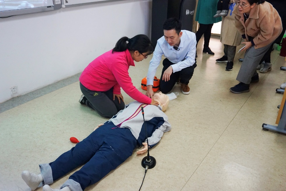 最后,现场部分老师还在专家指点下,亲自进行了心肺复苏模拟演练。本次急救培训是通过线上线下相结合的方式,有近80位教师通过网络直播方式观看了培训讲座。活动还进行了录屏,供因工作忙碌未及收看的老师回看学习。