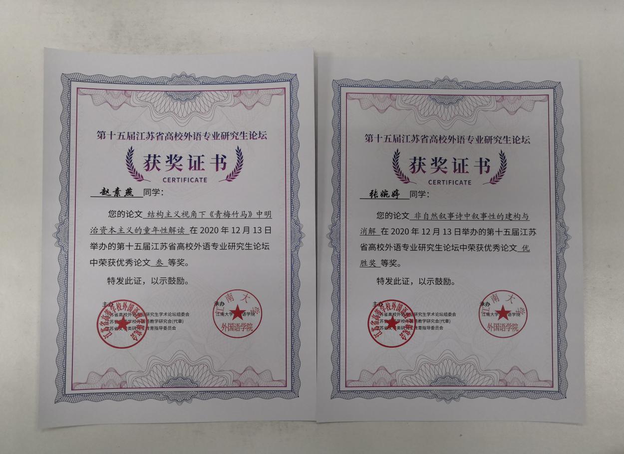 当天下午的分论坛研讨共设翻译学、文学与文化、语言学三个分论坛。本次学术论坛共收到参会论文243篇,进入分论坛研讨的有49篇。研讨环节主要由参会同学简要汇报论文提纲,点评专家提出改进建议两部分组成。我院外国语言文学张婉婷和赵素燕两位同学参加了文学与文化分论坛,分别宣读了论文“非自然叙事诗中叙事性的建构与消解”和“结构主义视角下《青梅竹马》中明治资本主义的童年性解读”,得到了苏州科技大学外国语学院副院长綦亮教授的指导。论坛闭幕式上,南京大学陈新仁教授做了总结讲话,并宣读了本届论坛获奖名单。经专家审议,我院赵素燕同学获三等奖,张婉婷同学获优胜奖。