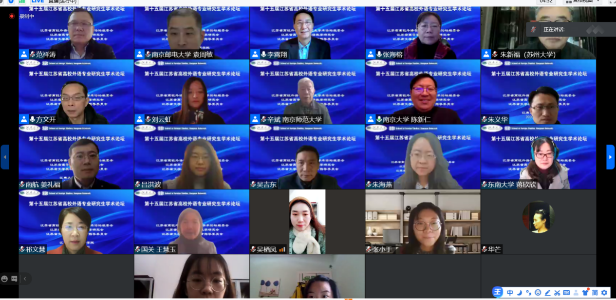 12月13日,第十五届“江苏省高校外语专业研究生学术论坛”于云端平台顺利召开。本届论坛由江苏省高校外语专业研究生学术论坛组委会、江苏省高等学校外语教学研究会、江苏省文学类研究生教育指导委员会主办,由江南大学外国语学院承办。我校文学院2019级的张婉婷和赵素燕两位研究生在副院长杜玉生副教授的带领下参加了此次论坛。