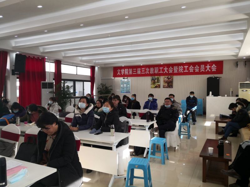 2021年1月8日上午,文学院召开三届三次教职工大会暨工会会员大会。为确保疫情防控不松懈,会议按照不超过50人上限要求,采取在教职工中心二楼多功能厅和文德楼C407多功能教室分设会场,以现场直播方式进行。党委书记朱庆峰主持会议。