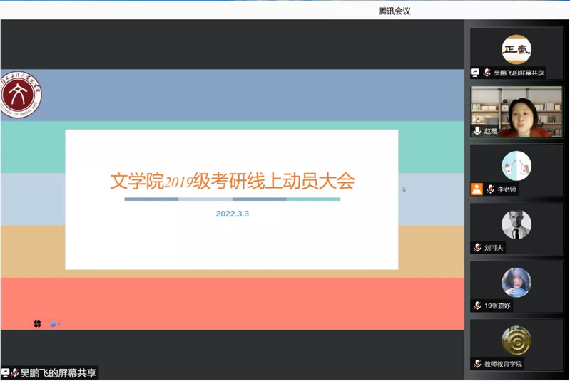 3月3日晚18:30,文学院召开2019级线上考研动员大会。会议旨在调动本院2019级本科生考研热情,普及考研相关知识,帮助19级学生尽快确立目标,进入备考状态。文学院副院长(主持工作)赵霞,校研究生招生办公室主任徐金花,教师教育学院党委副书记、副院长王平,文学院各系指导教师和2019级辅导员李渊,以及全体19级本科生参加会议。会议由院党委副书记、副院长吴鹏飞主持。