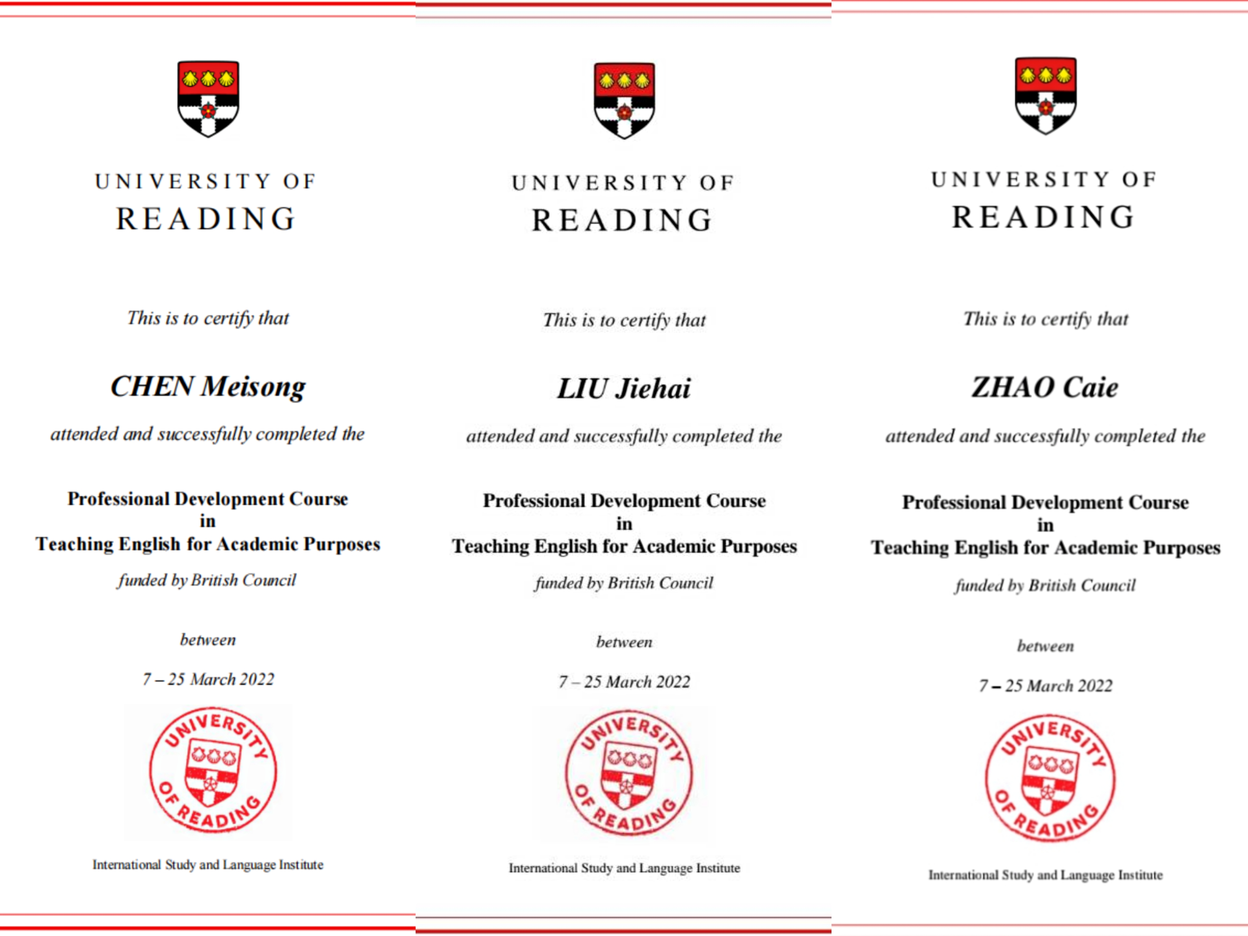 本次线上培训从2022年3月7开始,至3月25日结束,共持续三个周。我校文学院18名外语教师利用课余时间积极参加了此次线上课程培训,并且全部顺利完成相关任务,通过课程考核,获得雷丁大学颁发的培训证书。本期课程培训依托雷丁大学优质教育教学资源,充分发挥雷丁大学EAP教学经验与优势,围绕EAP教学与科研两大核心主题,通过线上讲座、交流问答、撰写反思日志等形式,有效促进了参训教师了解国际前沿EAP先进教学理念,优化课堂教学活动,提高EAP论文写作与发表能力,从而为提高我校人才培养质量提供了坚实保障。