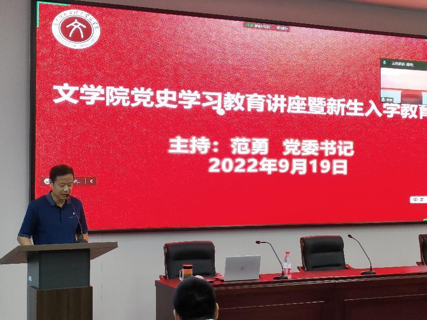 9月19日下午,文学院举办党史学习教育暨新生入学党性修养教育,教育活动以线上线下相结合方式举行,线下学习教育活动设在文德楼N301多功能教室。特邀校关工委社会主义核心价值观讲师团成员、马克思主义学院苏向荣教授做题为“应对风险:汲取百年党史中的智慧与力量”的讲座,文学院全体院领导、全体师生党员、积极分子和全体研究生、本科生新生参加学习教育活动,院党委书记范勇主持该活动。