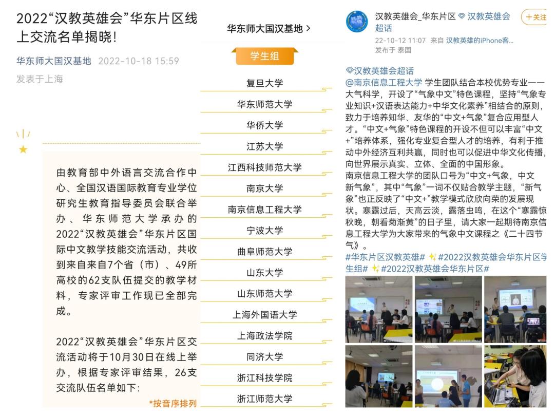 近日,教育部中外语言交流合作中心、全国汉语国际教育专业学位研究生教育指导委员会联合举办、华东师范大学承办的2022“汉教英雄会”华东片区国际中文教学技能交流活动,目前已完成专家评审工作。在7个省(市)、49所高校的62支队伍提交的教学材料中,我院“中文+气象”主题课程脱颖而出,成功进入2022“汉教英雄会”华东片区交流活动阶段。