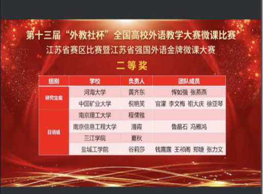 2022年11月12日,第十三届“外教社杯”全国高校外语教学大赛微课比赛江苏省赛区比赛暨江苏省强国外语金牌微课大赛评审成功落下帷幕。我院潘霞、鲁晶石、冯雁鸿团队在本届比赛中勇创佳绩,荣获日语组二等奖。