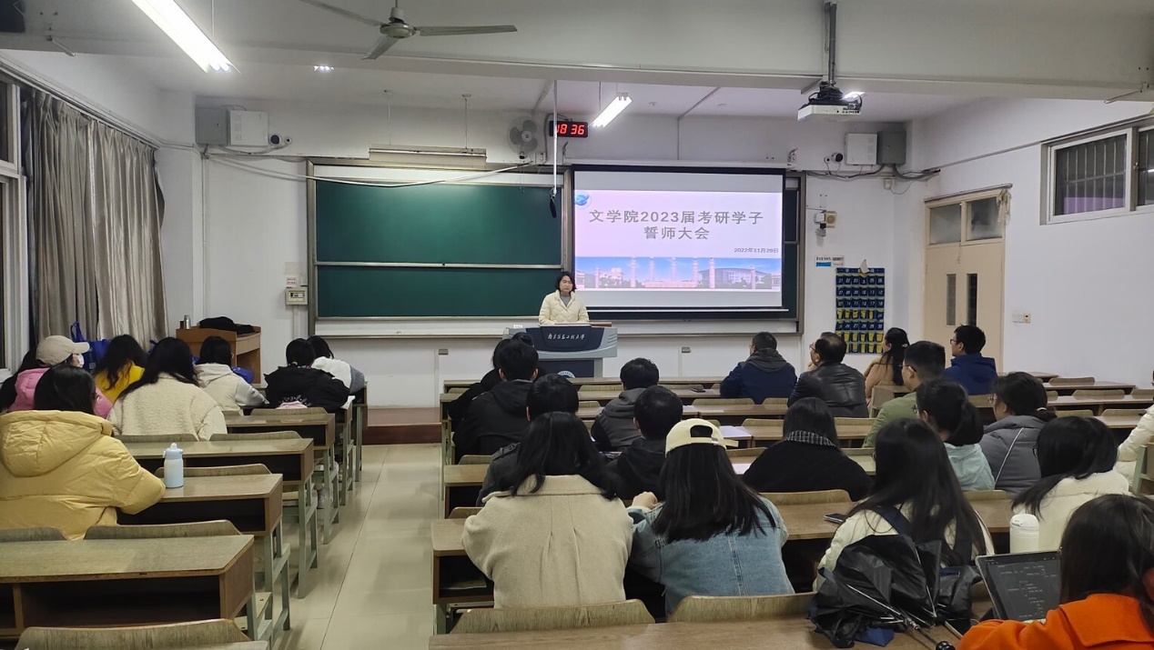 读书不觉“冬”转寒,一寸光阴一寸金,考研初试已越来越近。为鼓舞考研学生士气、坚定学生考研信念、增强备考信心,11月29日晚,文学院在文德楼S608教室召开2023届考研学子誓师大会。文学院院长赵霞、院党委副书记(主持工作)郭雨率全体院领导班子慰问2019级全体考研同学。