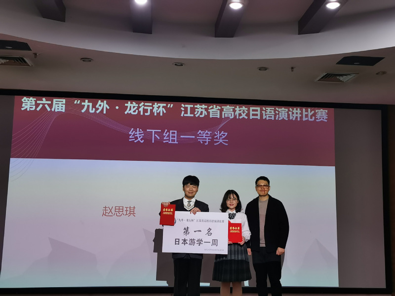 12月10日,由中国日语教学研究会江苏分会主办、南京林业大学外国语学院承办的第六届“九外·龙行杯”江苏省高校日语演讲比赛在南林大厦落下帷幕。我校文学院日语系学生赵思琪斩获一等奖。