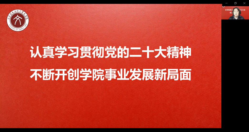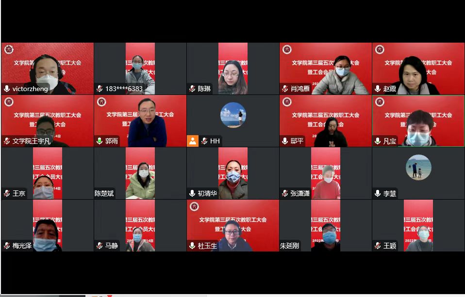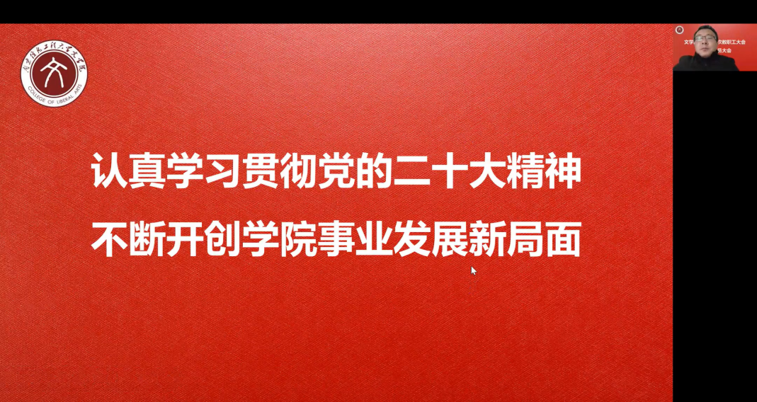 12月14日晚,文学院召开第三届五次教职工大会暨工会会员大会。本次大会的主题是“认真学习贯彻二十大精神,不断开创学院事业发展新局面”。因疫情原因,全体教职员以在线方式参会,会议由院党委副书记(主持工作)郭雨主持。
