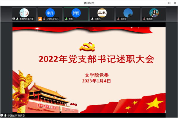 为进一步加强党对教育工作的全面领导,不断强化学院基层党组织建设,1月4日上午10:00,文学院在线上举行2022年度党支部书记述职大会。院党委副书记(主持工作)郭雨、副书记兼副院长吴鹏飞、副院长杜玉生、副院长郑友奇以及学院全体党委委员、基层党组织书记参加会议。