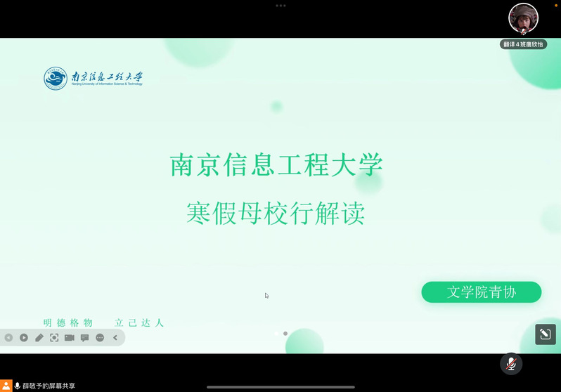 张潇潇老师向同学们强调了本次“优秀学子母校行”活动的重要意义,介绍了本次活动政策和相关资料,希望大家以本次活动为契机,通过讲述南信大故事,向高中母校领导、老师和学弟学妹们展现信大风采和优秀学子风范。文学院青协薛敬予同学介绍了实践流程及相关注意事项,他着重介绍了宣讲过程中的方式技巧,如何结合自身在校学习生活经历进行恰当而令人印象深刻的讲解,展现信大学子的优秀风采。2022年母校行活动优秀学生代表夏芸菲和张琪琦依次进行相关经验分享。