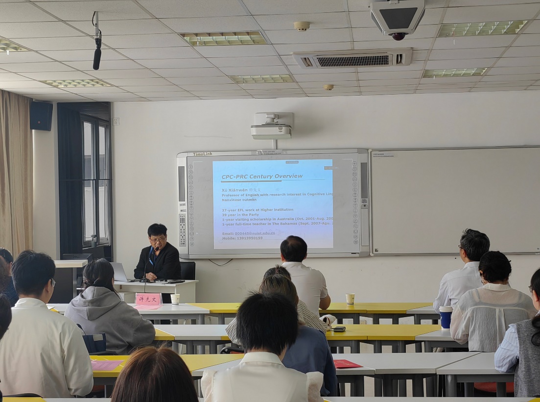 文学院原党委书记、校关工委巡讲团成员许先文以双语形式为现场党员讲授党课。他从语言学的角度,回顾了中国共产党领导我国从站起来、富起来、强起来的伟大历程,简要介绍了当前国内国际新形势,让大家深刻认识今天稳定发展的局面来之不易。他深入剖析语言学专业对国家战略的重要意义,作为文学院的学生,要树立专业自信,将青年的责任担当与国家建设发展相联系。“语言反映一个民族的文化”,要结合中西方文化学好、用好语言工具,未来更好地服务国家需求。