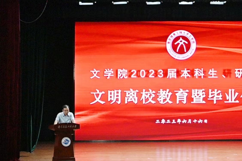 请君试问东流水,别意与之谁短长。6月16日下午,文学院在大活剧场举行2023届文明离校教育暨毕业仪式。全体院领导、系主任、学位点负责人、毕业研究生导师、辅导员和毕业班班主任等教师代表出席活动,2023届全体毕业本科生、研究生以及部分低年级学生代表共400余人参加了活动。活动由学院党委副书记(主持工作)郭雨主持。