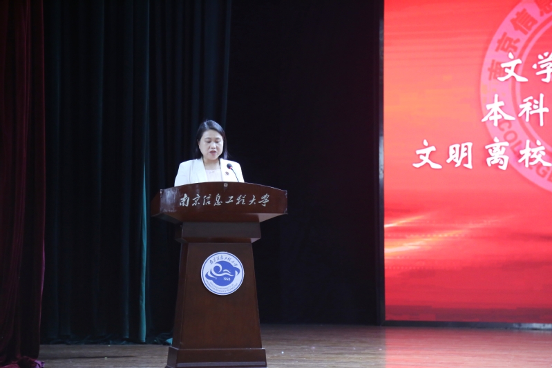 教师代表焦俊霞教授临别赠言情深意重,她以“责任”与“担当”、“勇气”与“坚强”与毕业生共勉。她希望即将步入社会的毕业生无论巅峰还是低谷,不管顺境还是逆境,都应从容面对,坚守初心。研究生辅导员邵芳作文明离校教育,希望同学们瞄准人生的新方向,在新的岗位上继续奋斗,继续拼搏。