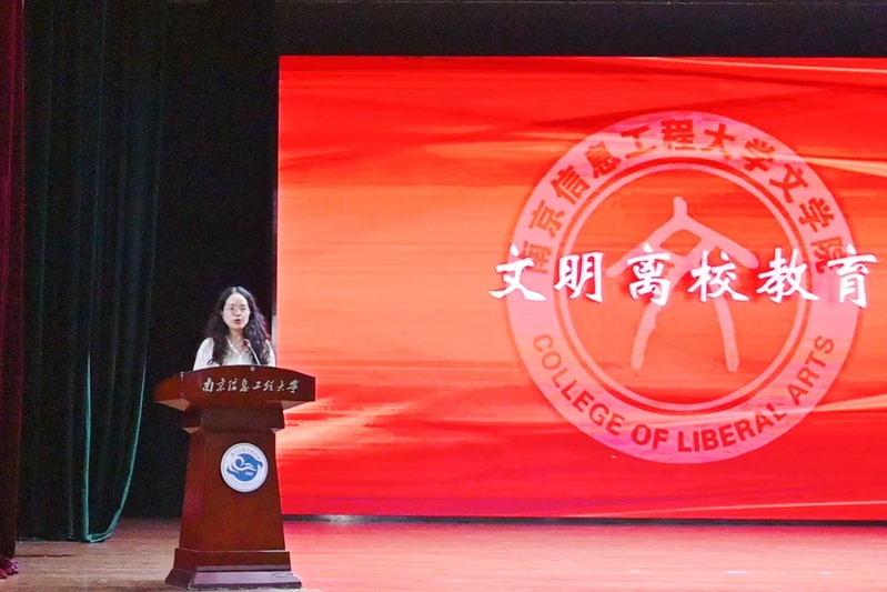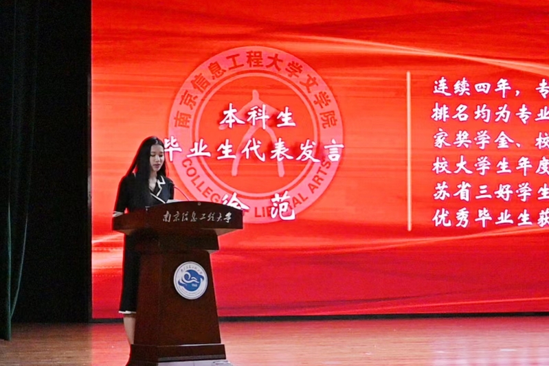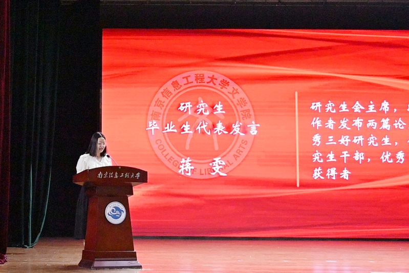 数载青春似水流年。仪式开始前,精心制作的毕业纪念视频便将师生们带回到记忆的长河之中。随后,毕业研究生代表通过诗朗诵《南信大》表达了对在校时光的思念和回忆,同时也向毕业生表献上了最诚挚的祝福。