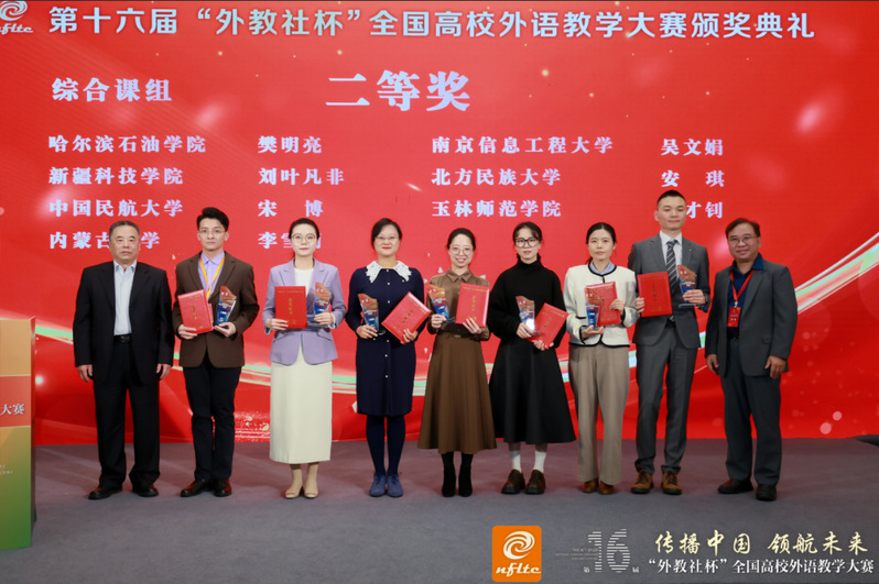 2025 年 12 月 4-7 日,第十六届“外教社杯”全国高校外语教学大赛全国决赛总决赛在上海成功举办。作为江苏省大学英语综合课组唯一代表,我院吴文娟老师凭借其扎实的专业素养、精湛的教学水平和娴熟的方法技巧,荣获该组别二等奖。这也是继2016年近10年后,我校老师再次入围国赛并获奖。